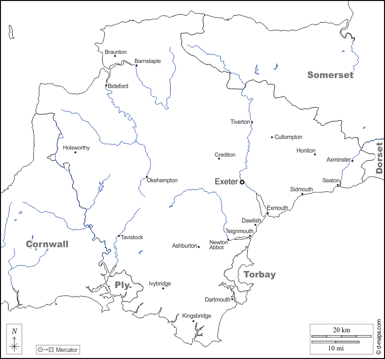 欧洲 > 英国 > 德文 > 边界, 水文学, 主要城市, 名称, 白