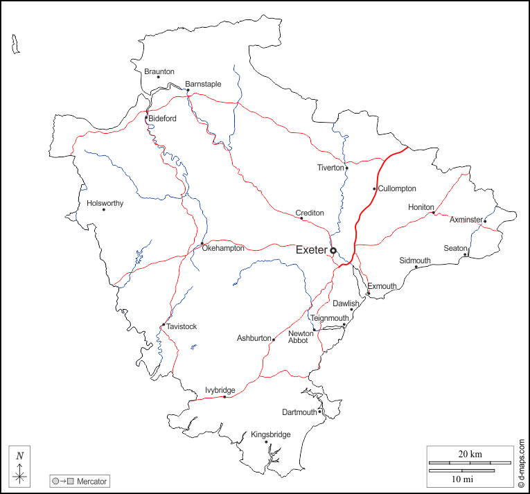 欧洲 > 英国 > 德文 > 大纲, 水文学, 主要城市, 道路, 名称, 白