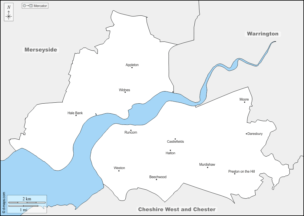 Appleton, Beechwood, Castlefields, Daresbury, Hale Bank, Halton, Moore, Murdishaw, Preston on the Hill, Runcorn, Weston, Widnes.