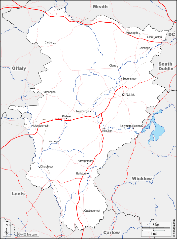 d-maps > 欧洲 > 爱尔兰 > 基尔代尔 > 边界, 水文学, 主要城市, 道路, 名称