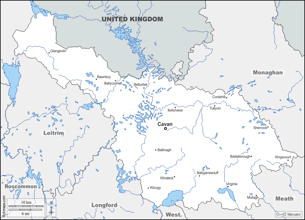 d-maps > 欧洲 > 爱尔兰 > 卡文 > 边界, 水文学, 主要城市, 名称