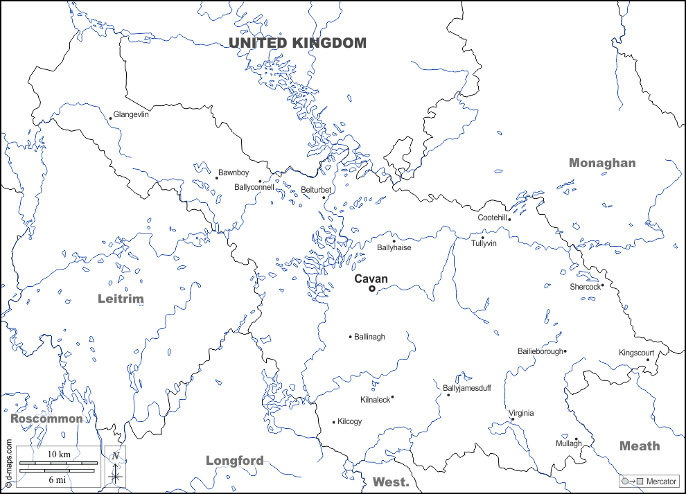d-maps > 欧洲 > 爱尔兰 > 卡文 > 边界, 水文学, 主要城市, 名称, 白