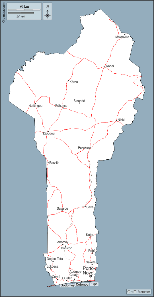 d-maps > أفريقيا > بنين > بنين > الخطوط العريضة, المدن الرئيسية, الطرق, أسماء