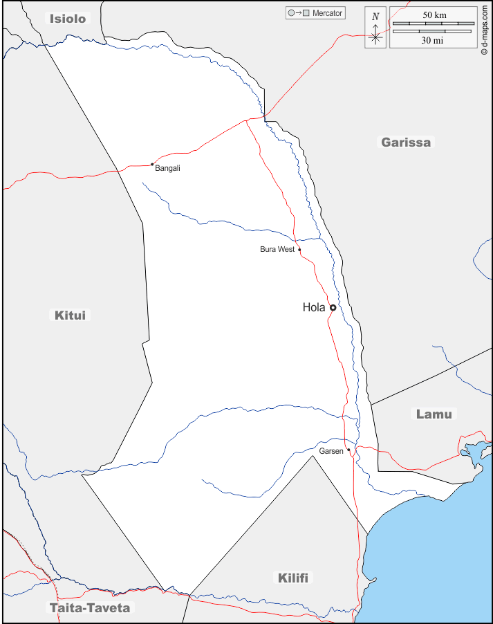 d-maps > أفريقيا > كينيا > مقاطعة نهر تانا > حدود, هيدروغرافيا, المدن الرئيسية, الطرق, أسماء