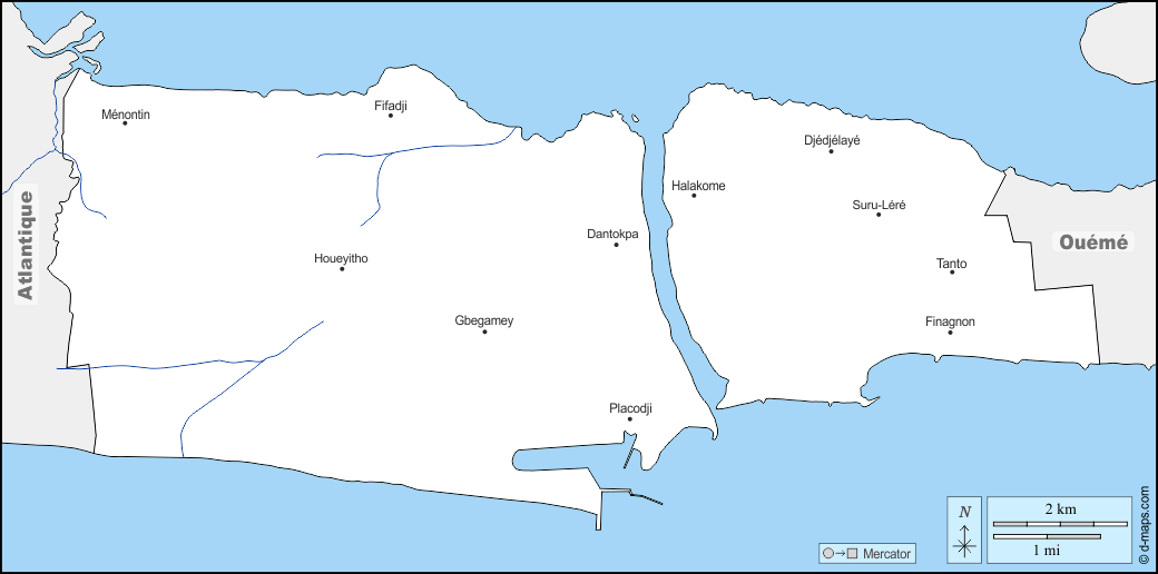 d-maps > أفريقيا > بنين > إدارة المناطق الساحلية > حدود, هيدروغرافيا, المدن الرئيسية, أسماء