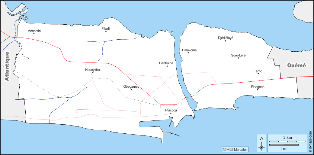 d-maps > أفريقيا > بنين > إدارة المناطق الساحلية > حدود, هيدروغرافيا, المدن الرئيسية, الطرق, أسماء