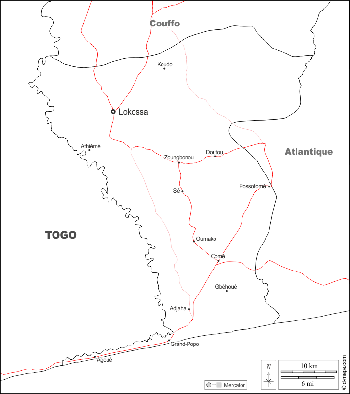 d-maps > أفريقيا > بنين > قسم المونو > حدود, المدن الرئيسية, الطرق, أسماء, أبيض