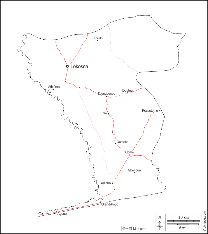 d-maps > أفريقيا > بنين > قسم المونو > الخطوط العريضة, المدن الرئيسية, الطرق, أسماء, أبيض