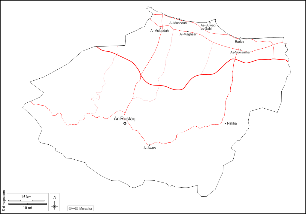 d-maps > سلطنة عمان > محافظة جنوب الباطنة > الخطوط العريضة, المدن الرئيسية, الطرق, أسماء, أبيض