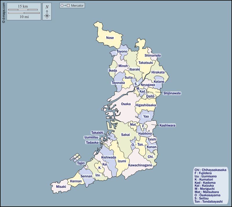 d-maps > Asien > Japan > Osaka > Umrisse, Gemeinden, Namen, Farbe