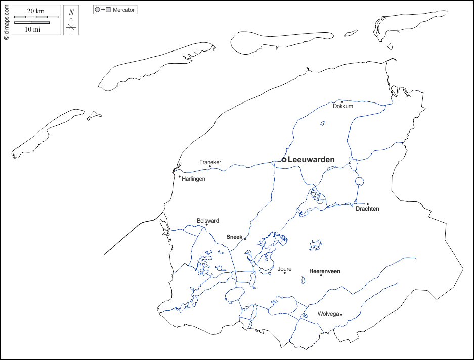 d-maps > Europa > Niederlande > Friesland > Umrisse, Hydrografie, Wichtige Städte, Namen, weiß