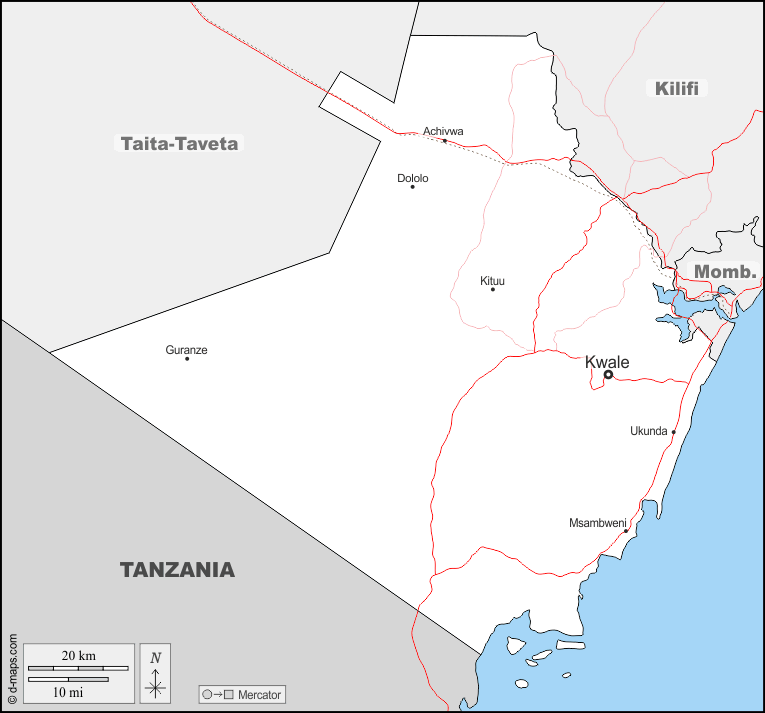 d-maps > Afrika > Kenia > Kwale County > Grenzen, Wichtige Städte, Straßen, Namen
