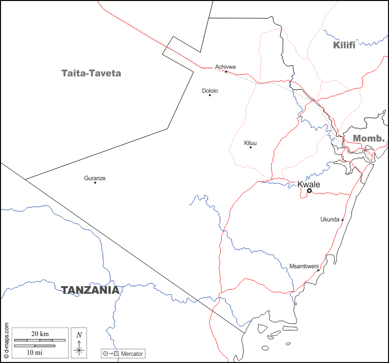 d-maps > Afrika > Kenia > Kwale County > Grenzen, Hydrografie, Wichtige Städte, Straßen, Namen, weiß