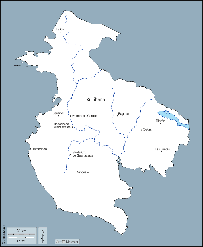 d-maps > Amerika > Costa Rica > Provinz Guanacaste > Umrisse, Hydrografie, Wichtige Städte, Namen