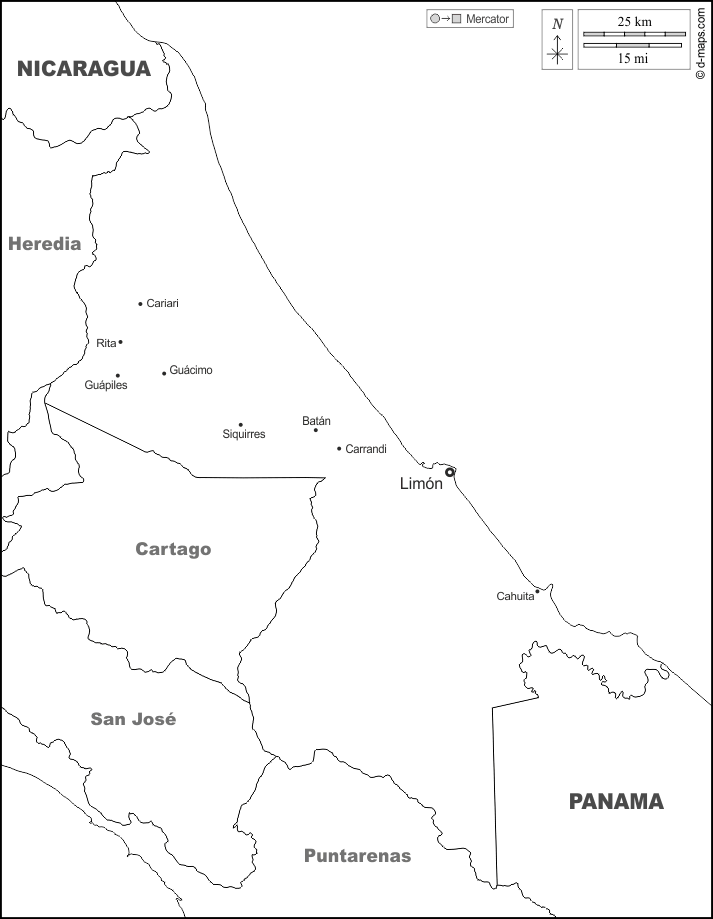 d-maps > Amerika > Costa Rica > Provinz Limón > Grenzen, Wichtige Städte, Namen, weiß