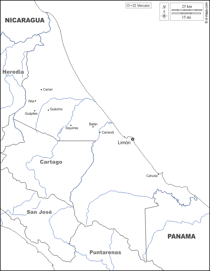 d-maps > Amerika > Costa Rica > Provinz Limón > Grenzen, Hydrografie, Wichtige Städte, Namen, weiß