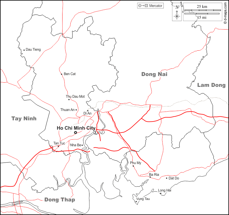 d-maps > Asien > Vietnam > Ho-Chi-Minh-Stadt > Grenzen, Wichtige Städte, Straßen, Namen, weiß