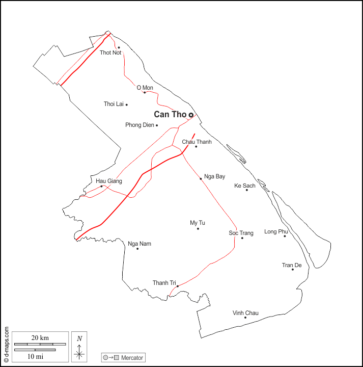 d-maps > Asien > Vietnam > Can Tho > Umrisse, Wichtige Städte, Straßen, Namen, weiß