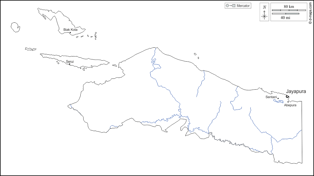 d-maps > Asien > Indonesien > Papua > Umrisse, Hydrografie, Wichtige Städte, Namen, weiß