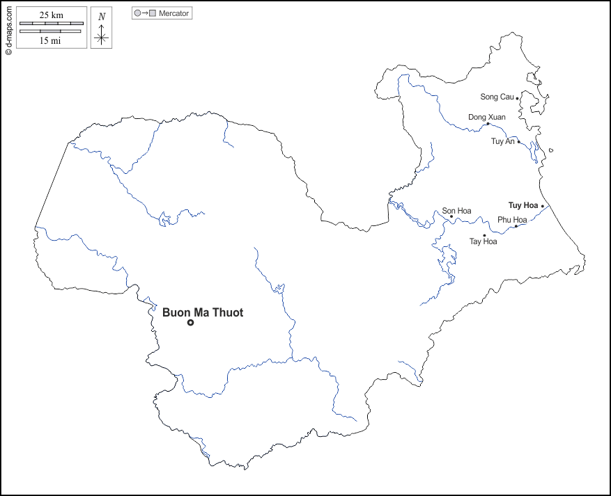d-maps > Asien > Vietnam > Provinz Dak Lak > Umrisse, Hydrografie, Wichtige Städte, Namen, weiß