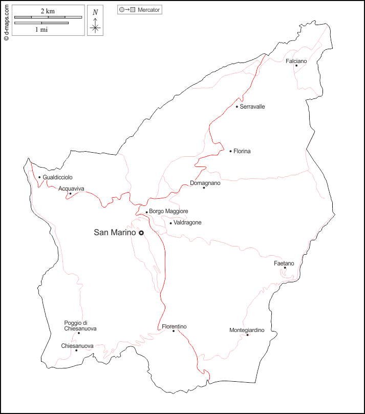 d-maps > Europa > San Marino > Umrisse, Wichtige Städte, Straßen, Namen, weiß