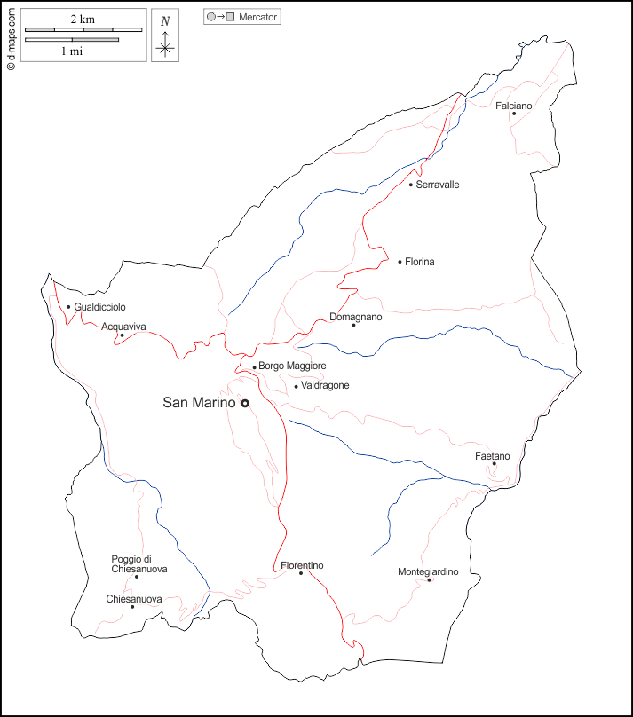 d-maps > Europa > San Marino > Umrisse, Hydrografie, Wichtige Städte, Straßen, Namen, weiß
