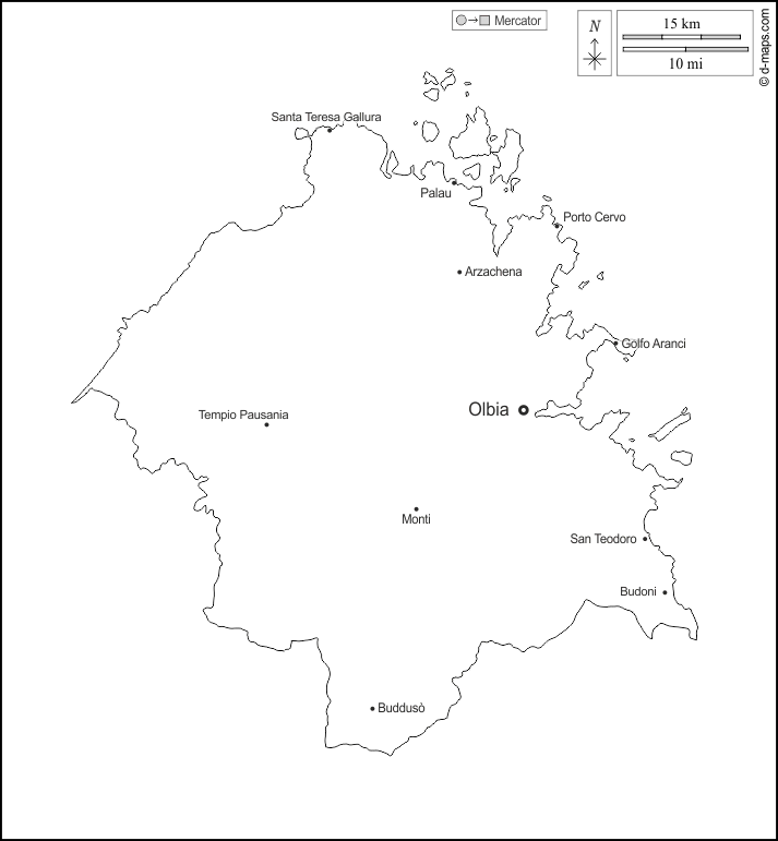 d-maps > Europa > Italien > Provinz Gallura Nord-Est Sardegna > Umrisse, Wichtige Städte, Namen, weiß
