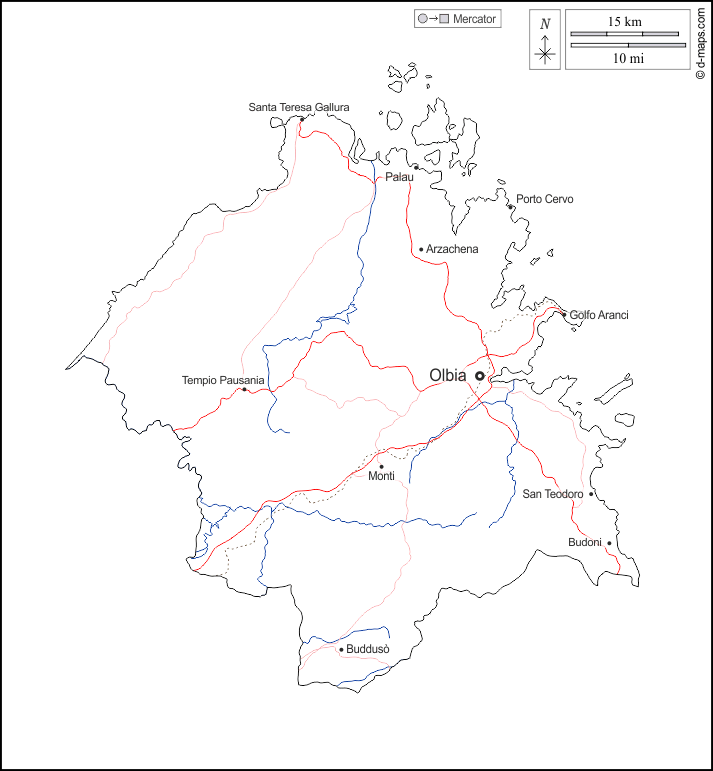 d-maps > Europa > Italien > Provinz Gallura Nord-Est Sardegna > Umrisse, Hydrografie, Wichtige Städte, Straßen, Namen, weiß