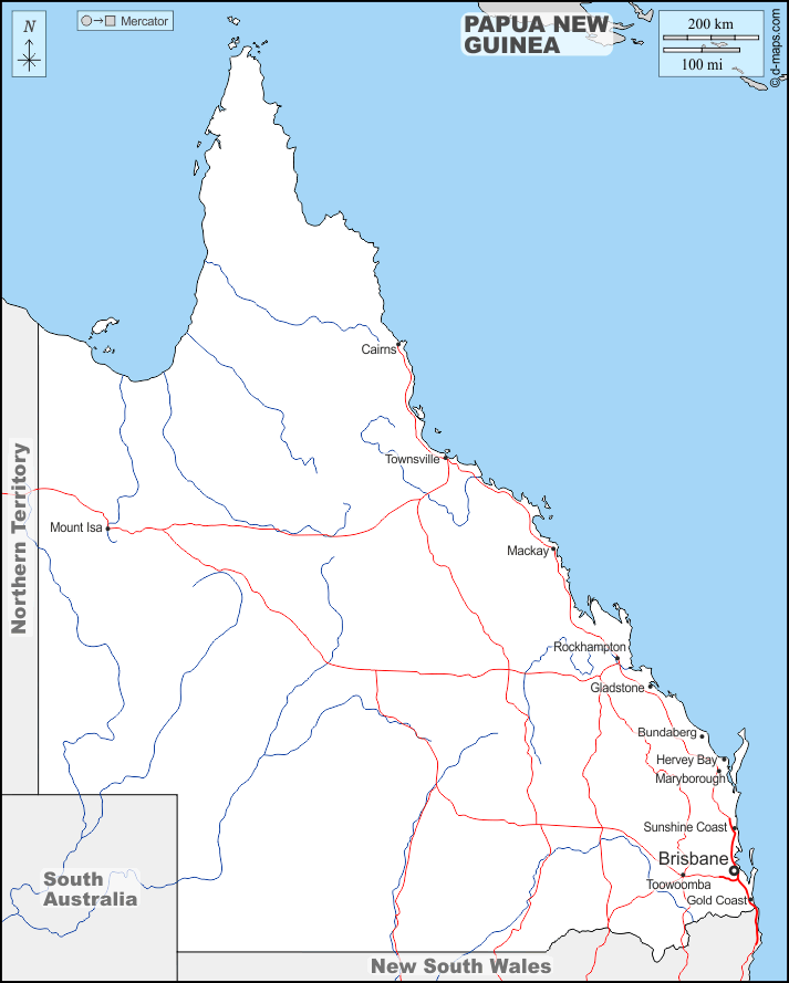 d-maps > Ozeanien > Queensland > Grenzen, Hydrografie, Wichtige Städte, Straßen, Namen
