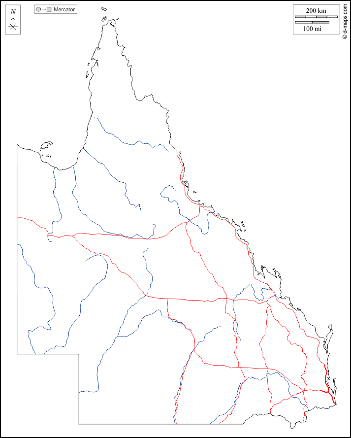 d-maps > Ozeanien > Queensland > Umrisse, Hydrografie, Straßen, weiß