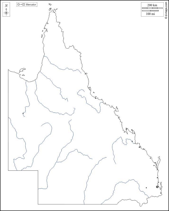 d-maps > Ozeanien > Queensland > Umrisse, Hydrografie, Wichtige Städte, weiß