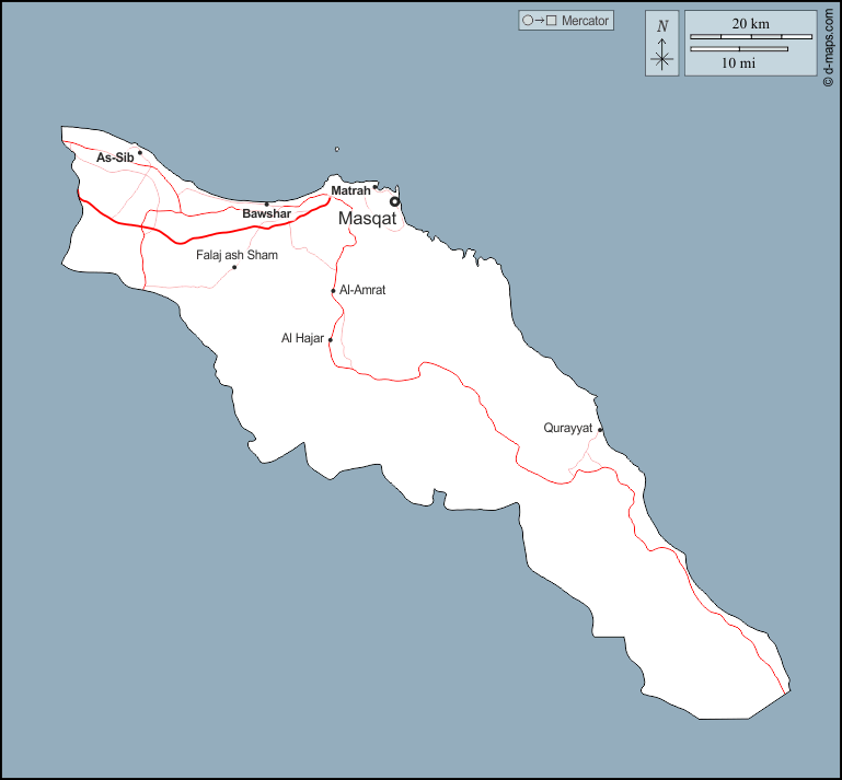 d-maps > Oman > Muscat Governorate > outline, main cities, roads, names