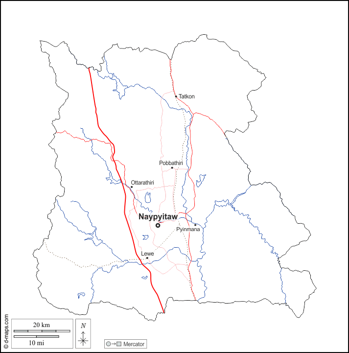 d-maps > Asia > Burma Myanmar > Naypyidaw Union Territory > outline, hydrography, main cities, roads, names, white