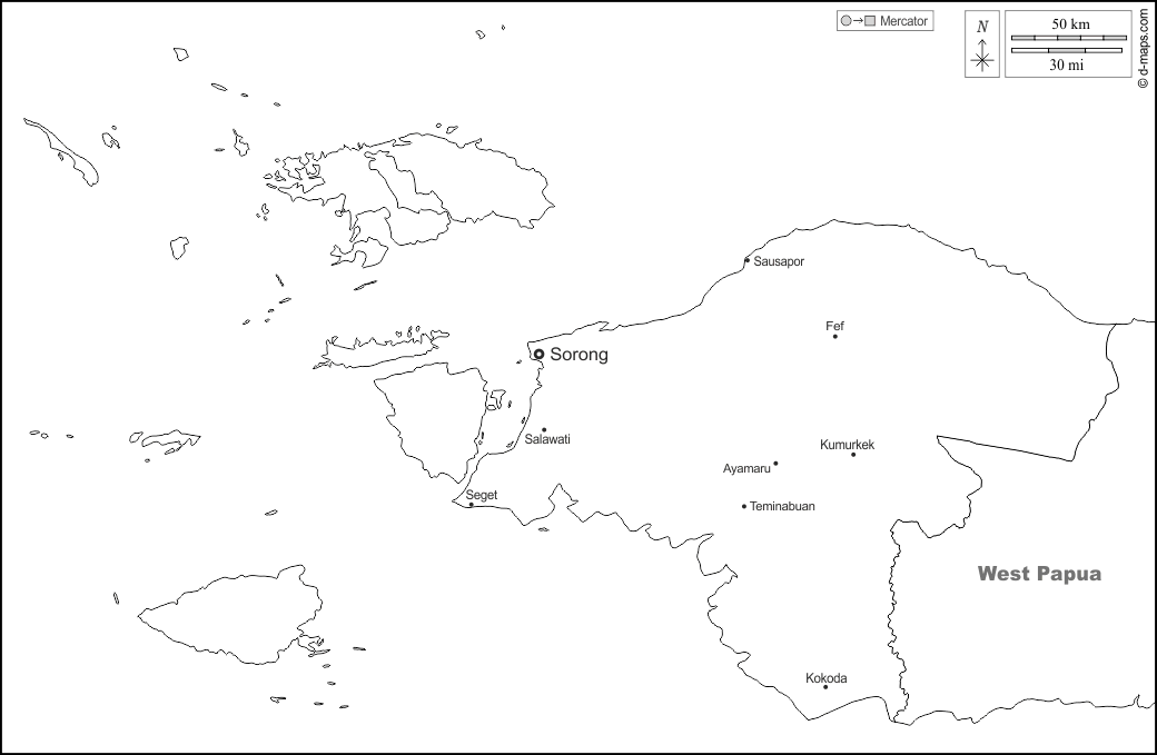 d-maps > Asia > Indonesia > Southwest Papua > boundaries, main cities, names, white