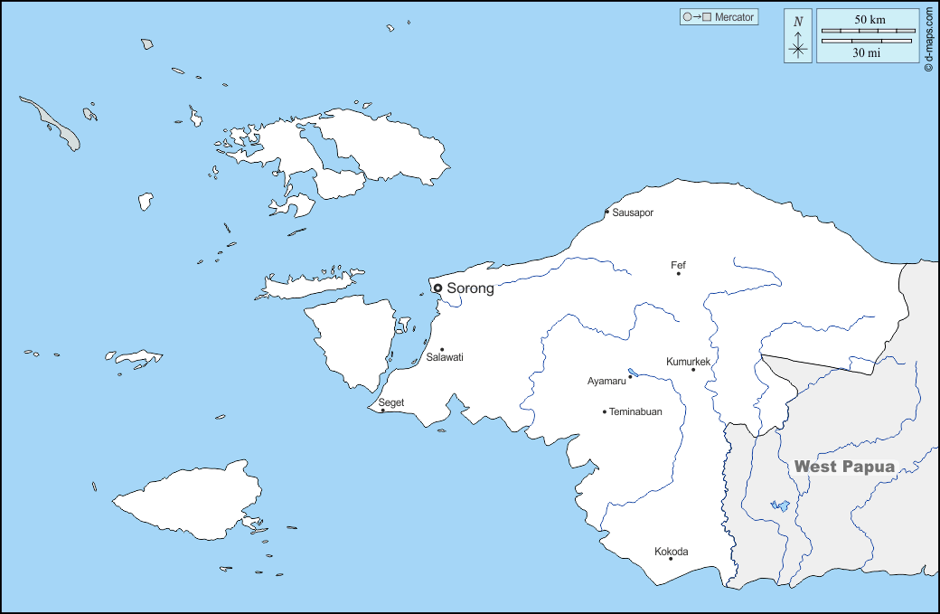 d-maps > Asia > Indonesia > Southwest Papua > boundaries, hydrography, main cities, names