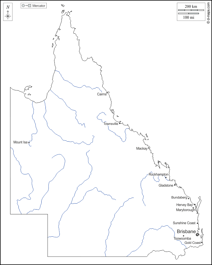 d-maps > Oceania > Queensland > outline, hydrography, main cities, names, white