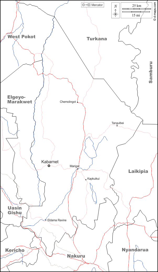 d-maps > África > Kenia > Condado de Baringo > fronteras, hidrografía, principales ciudades, carreteras, nombres, blanco
