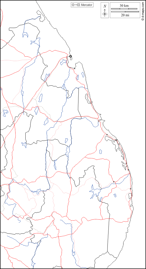 d-maps > Asia > Sri Lanka > Provincia Oriental > fronteras, hidrografía, principales ciudades, carreteras, blanco