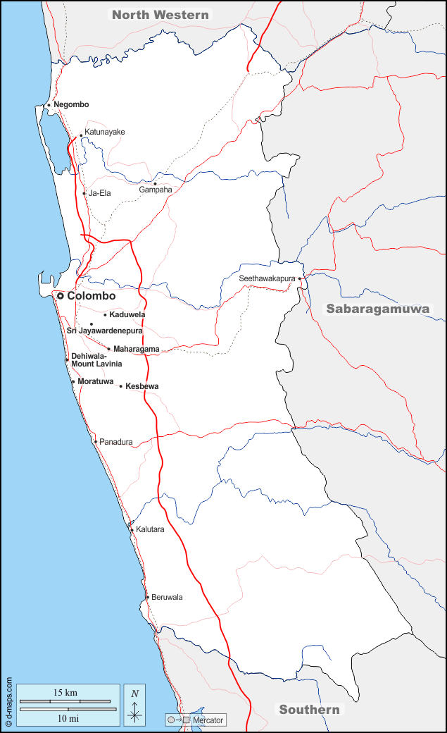 d-maps > Asia > Sri Lanka > Provincia Occidental > fronteras, hidrografía, principales ciudades, carreteras, nombres