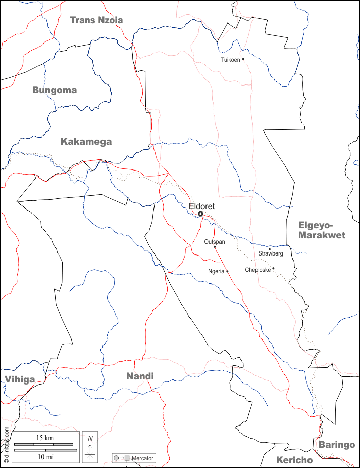 d-maps > África > Kenia > Condado de Uasin Gishu > fronteras, hidrografía, principales ciudades, carreteras, nombres, blanco