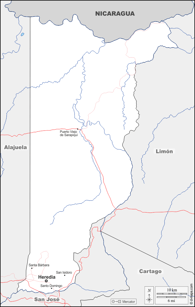 d-maps > América > Costa Rica > Provincia de Heredia > fronteras, hidrografía, principales ciudades, carreteras, nombres