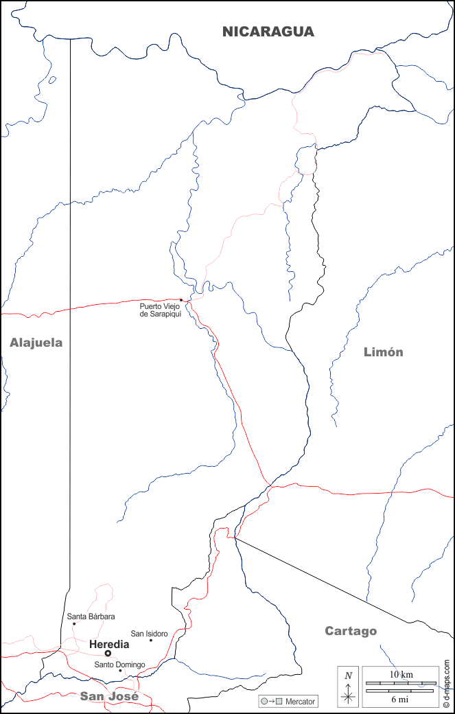 d-maps > América > Costa Rica > Provincia de Heredia > fronteras, hidrografía, principales ciudades, carreteras, nombres, blanco