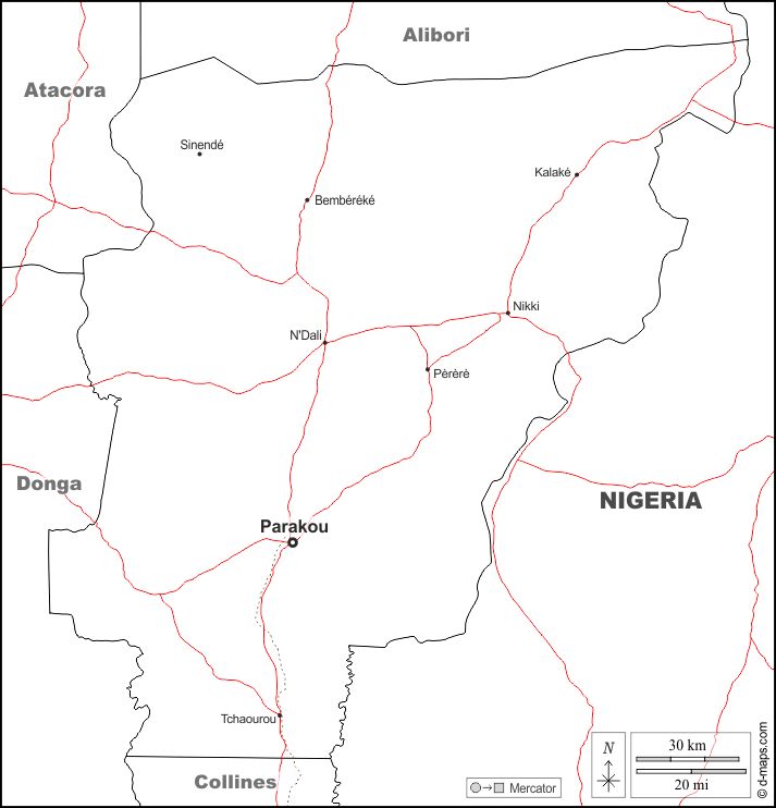 d-maps > África > Benín > Departamento de Borgou > fronteras, principales ciudades, carreteras, nombres, blanco