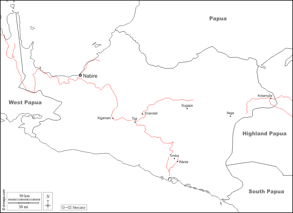 d-maps > Asia > Indonesia > Papúa Central > fronteras, principales ciudades, carreteras, nombres, blanco