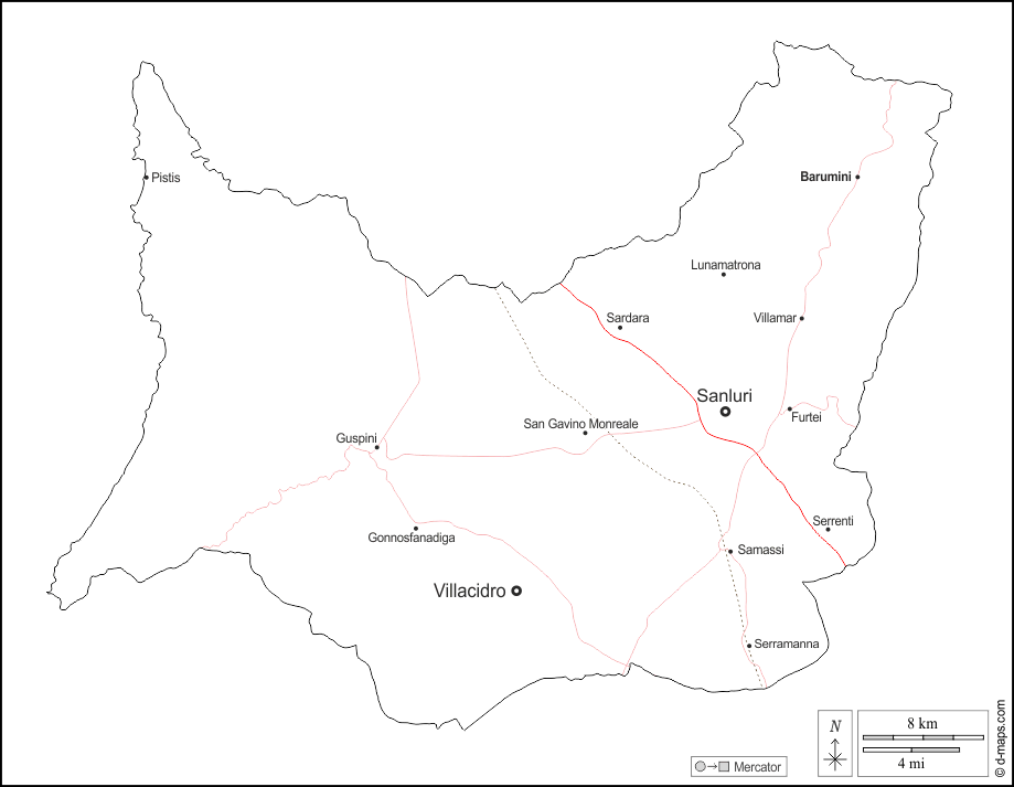 d-maps > Europa > Italia > Provincia de Medio Campidano > contornos, principales ciudades, carreteras, nombres, blanco