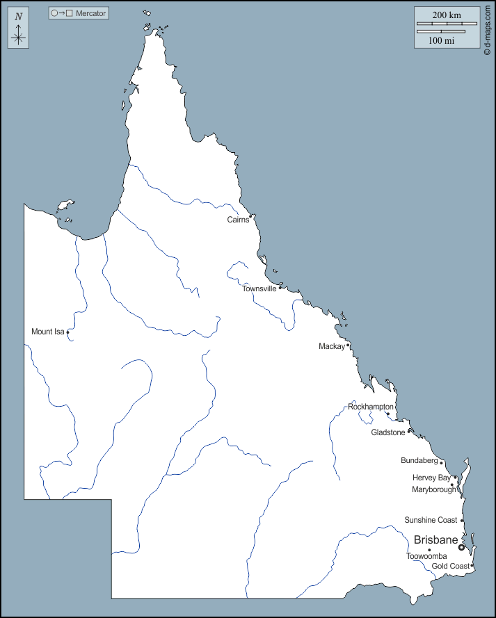 d-maps > Oceania > Queensland > contornos, hidrografía, principales ciudades, nombres