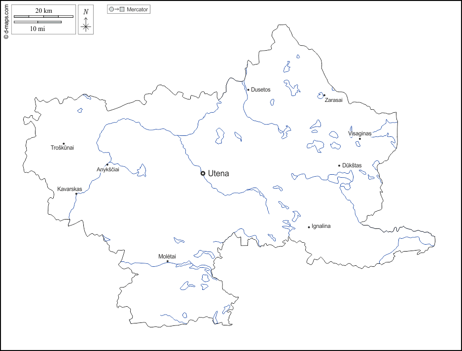 d-maps > Europe > Lituanie > Utena > contours, hydrographie, principales villes, noms, blanc