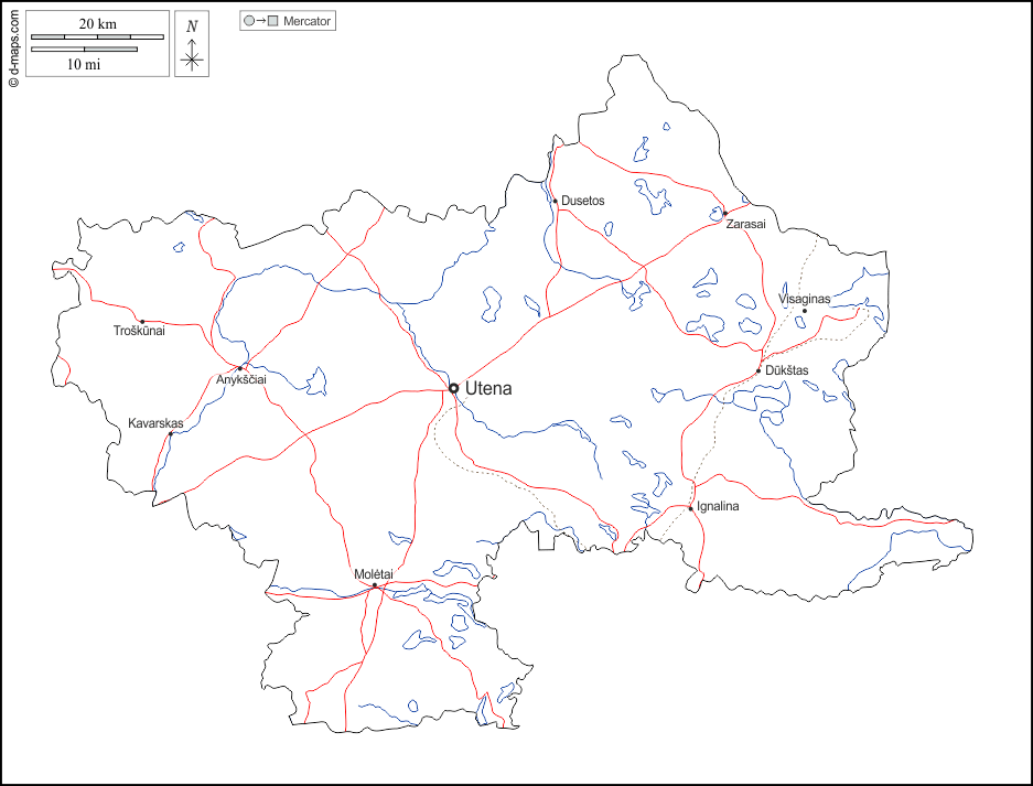 d-maps > Europe > Lituanie > Utena > contours, hydrographie, principales villes, routes, noms, blanc