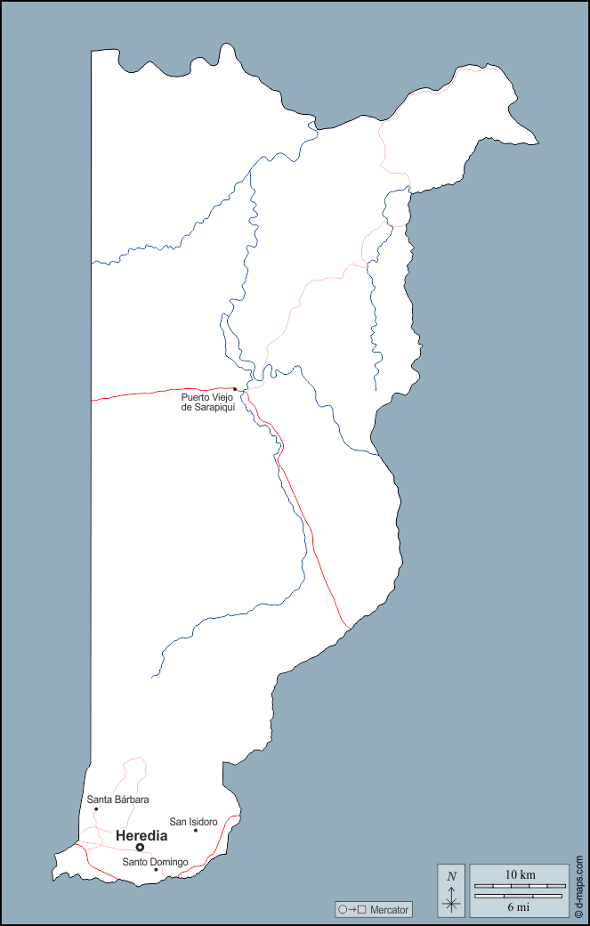 d-maps > Amériques > Costa Rica > Province d'Heredia > contours, hydrographie, principales villes, routes, noms
