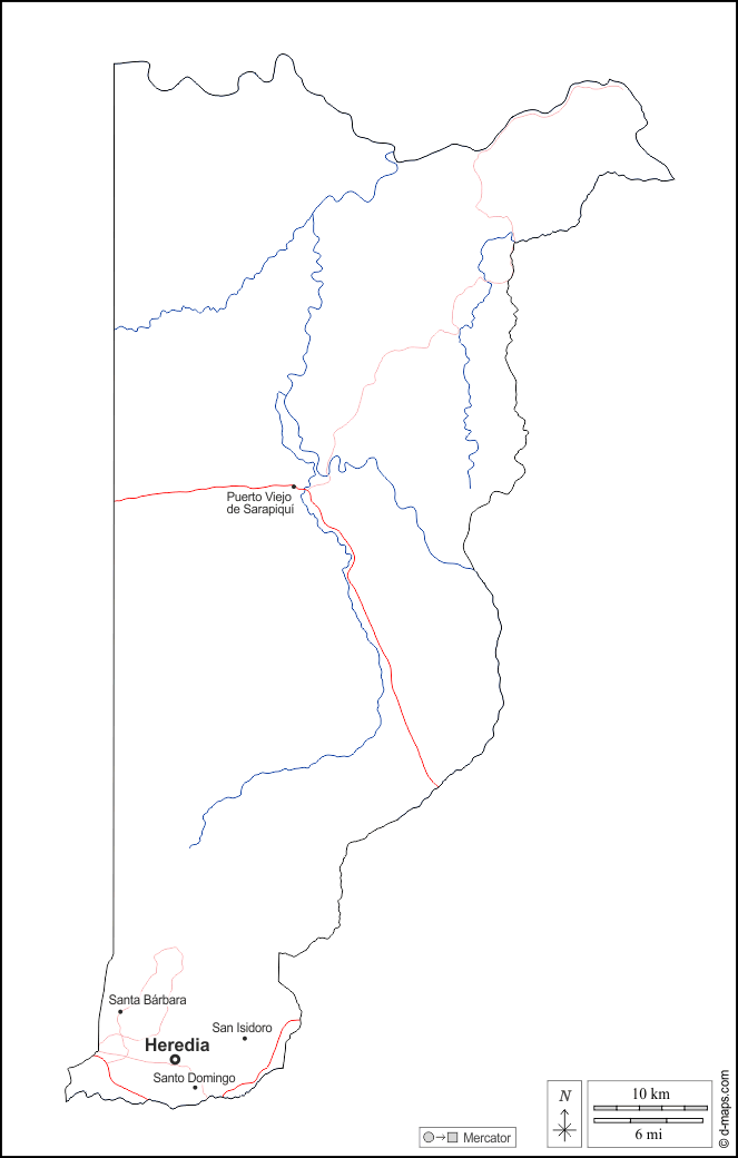 d-maps > Amériques > Costa Rica > Province d'Heredia > contours, hydrographie, principales villes, routes, noms, blanc